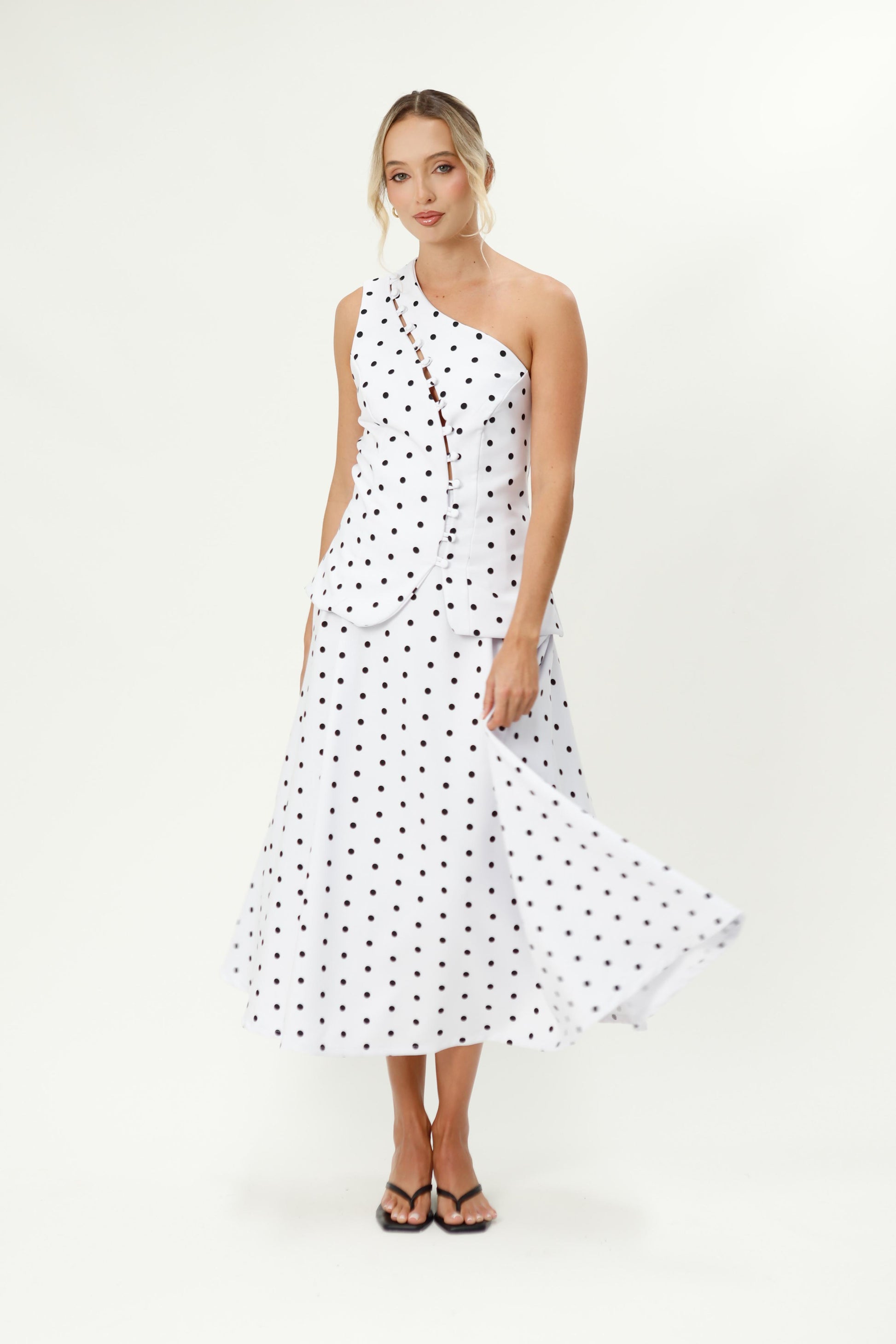 Set sofisticado y moderno diseñado para robar miradas. Su top de un solo hombro con escote asimétrico estiliza el torso y aporta un toque elegante, mientras que el detalle de ojalillos/bolitas forradas en diagonal crea un efecto visual único y súper femenino. La silueta es entallada en la parte superior y se abre sutilmente en el ruedo tipo peplum, resaltando cintura y cadera con una caída impecable.
