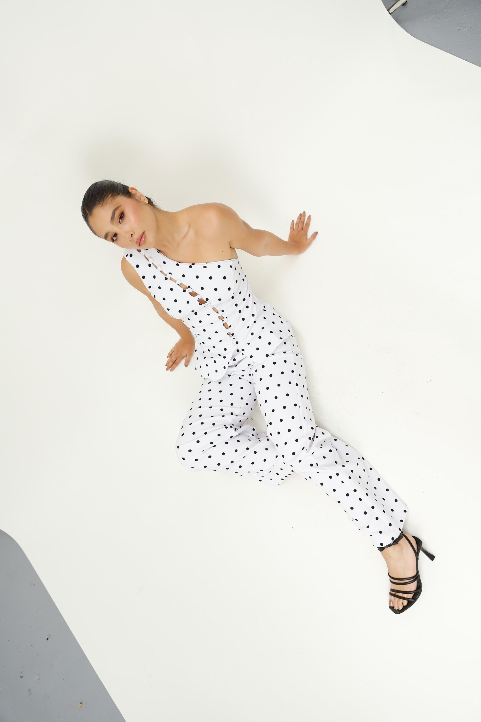 Un set pensado para robar miradas sin esfuerzo. Con silueta sastre y diseño asimétrico, este conjunto combina un top de un solo hombro con una línea de botones forrados en diagonal que deja sutiles aberturas, creando un efecto moderno y ultra femenino. La parte baja del top tiene un leve vuelo tipo peplum que define la cintura y estiliza la cadera, mientras que la espalda con tiras y frunce se adapta cómodamente al cuerpo.