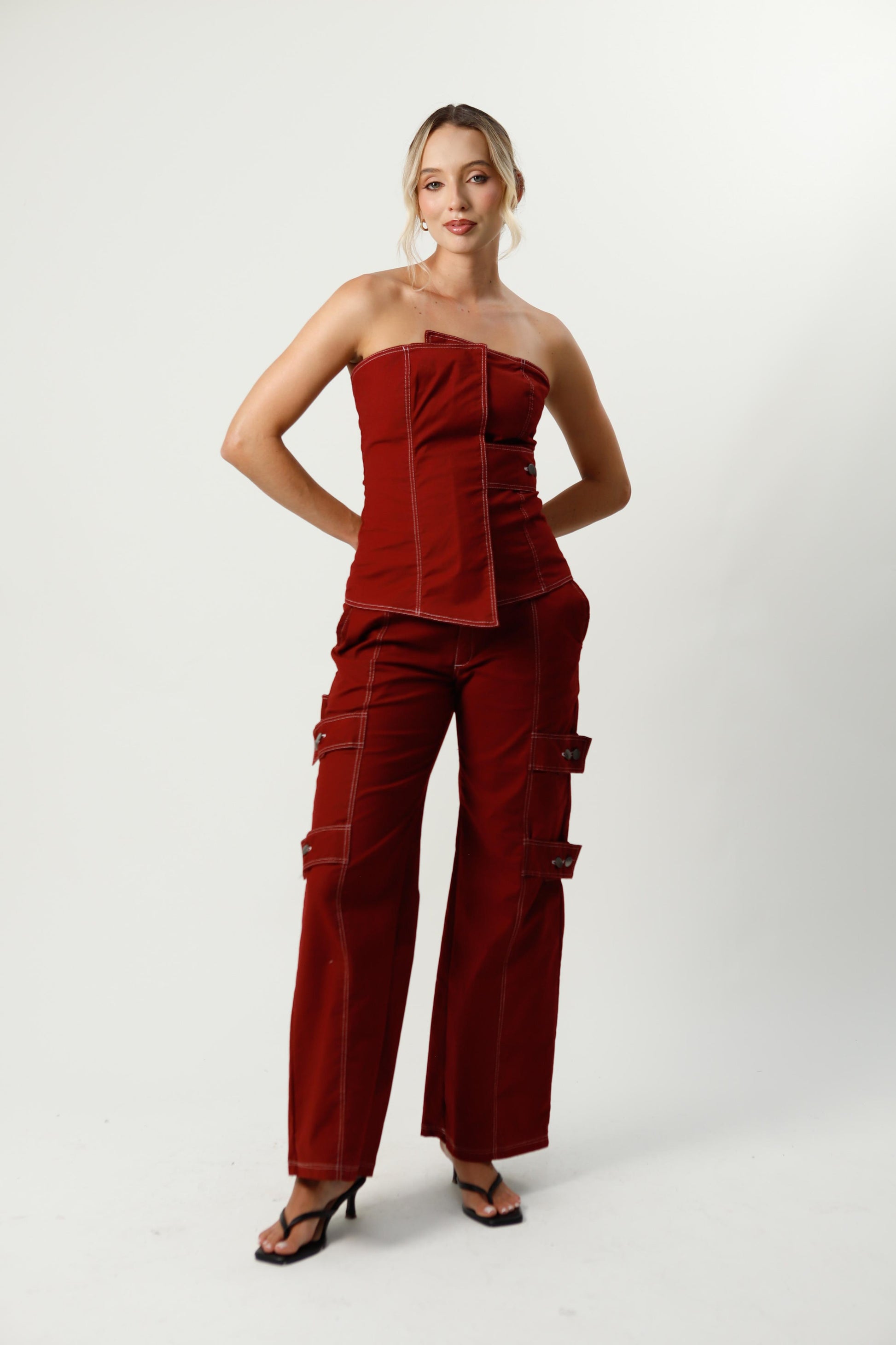 Set de dos piezas con actitud utilitaria y vibe sofisticada. Incluye top strapless estructurado con diseño asimétrico tipo sobrepuesto que estiliza el torso y aporta un look moderno, y pantalón cargo de tiro alto con bota recta amplia para alargar visualmente las piernas. Las costuras marcadas en contraste y los bolsillos laterales con tapas le dan ese toque urbano-elegante que lo hace único y demasiado versátil.